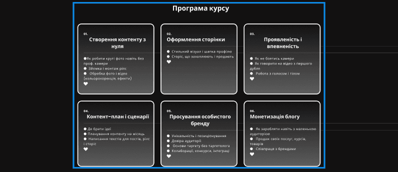 Задача: створення продаючого лендінгу до запуску онлайн курсу клієнта. Основні кольори, шрифт є деталями що формують особистий бренд клієнта
