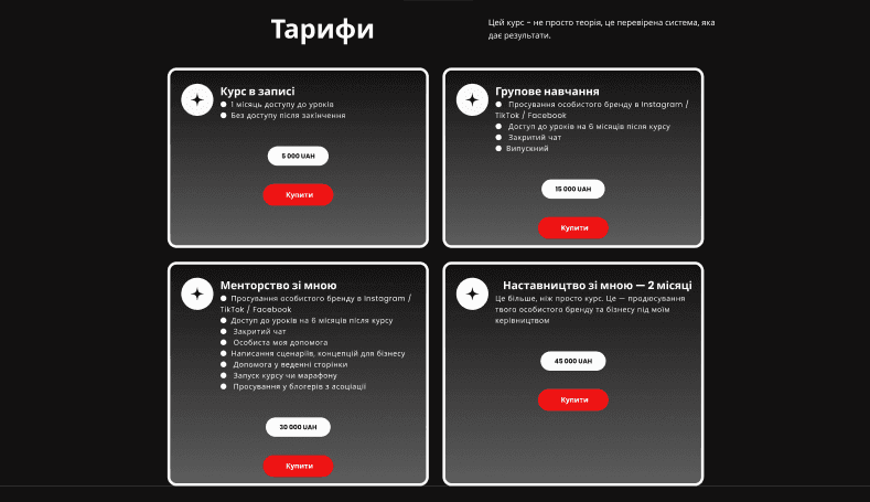 Конструктор для створення лендінгу Weblium. Кольори сайту: чорний, білий, червоний для елементів. Розробка дизайну та верстання сайту зайняла 7 днів. +3 дні для підключення прямої оплати на сайті